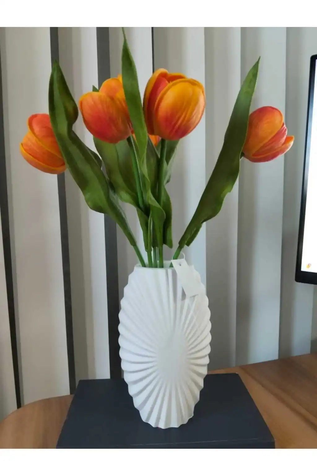 - 5 adet yapay lale, şık vazo setiyle birlikte sunulur.; - Menşei Türkiye'den gelen bu çiçekler, yerel kaynaklıdır.; - Demet halindeki yapay laleler, doğal görünümleriyle ev dekorasyonunuza zarif bir dokunuş katar.; - 35 CM yüksekliği sayesinde farklı mekanlara kolayca uyum sağlar.